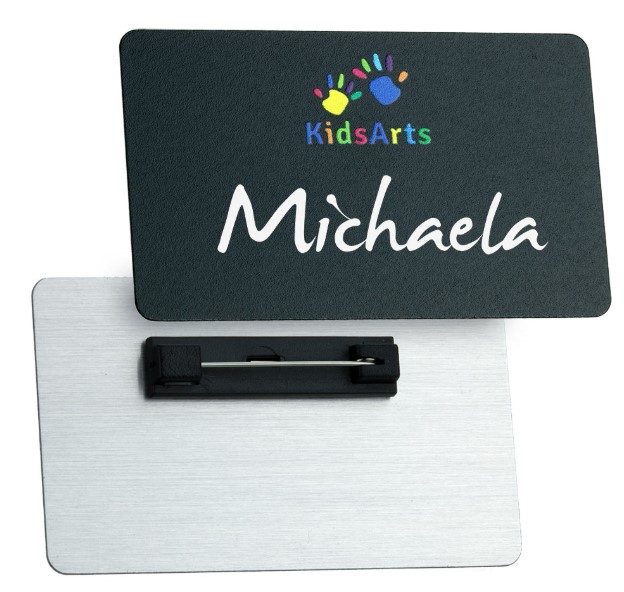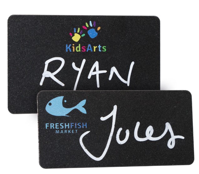 Black coated aluminium name badges designed for use with liquid chalk pens. Full colour printed logo with hand written personalisation that can be wiped clean and used again and again.