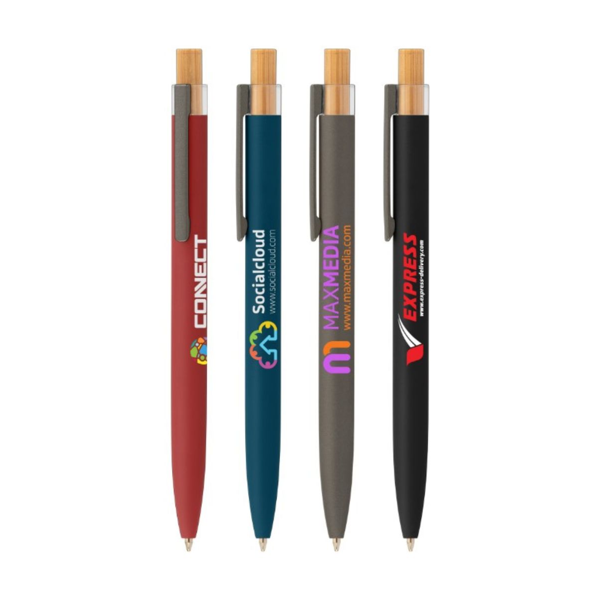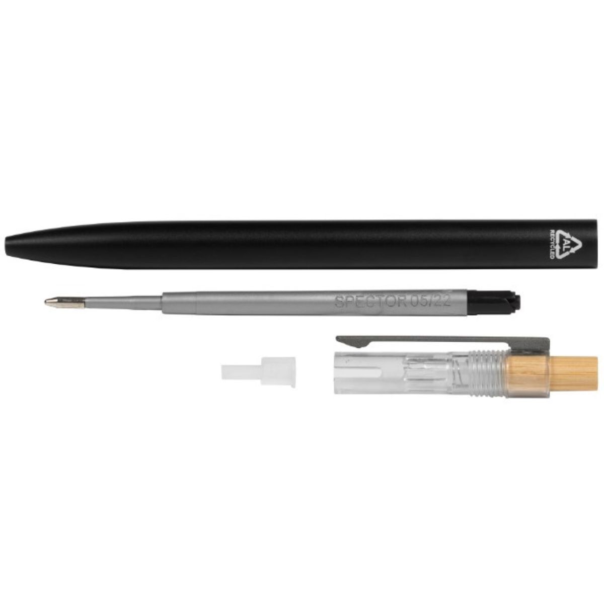 This sleek pen is crafted from recycled aluminium, featuring a renewable bamboo plunger, gunmetal stainless-steel clip and clear RPET recycled plastic contour.