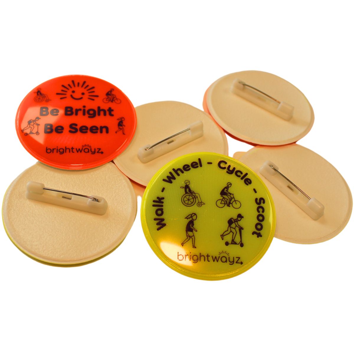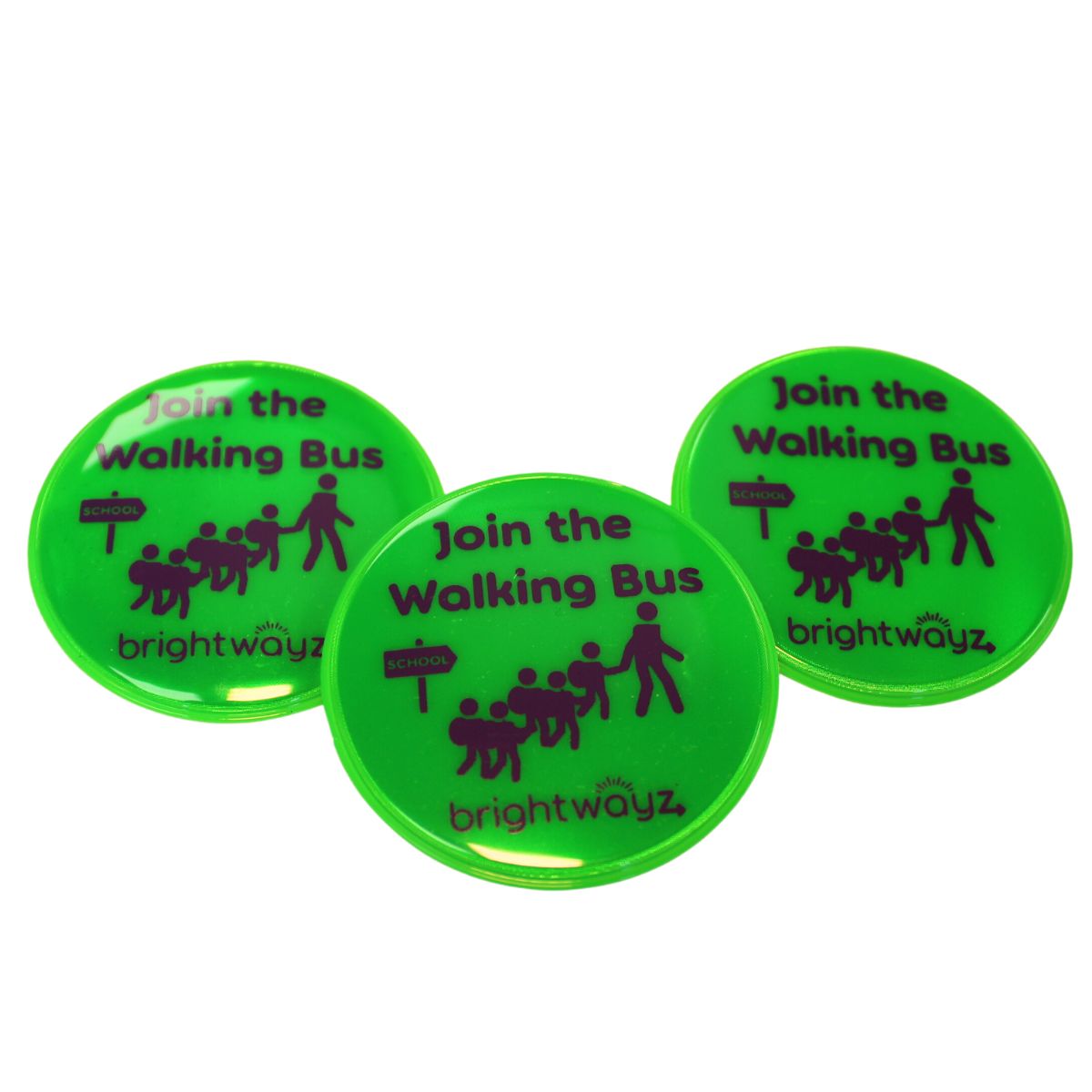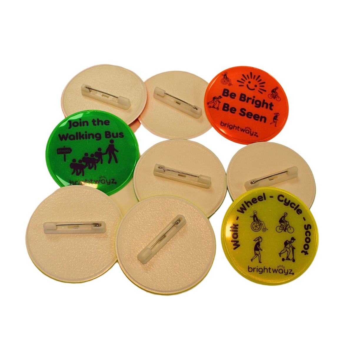 Pin to bags or clothing. Fun and bright, they show up day or night. Great for promoting active travel for children.