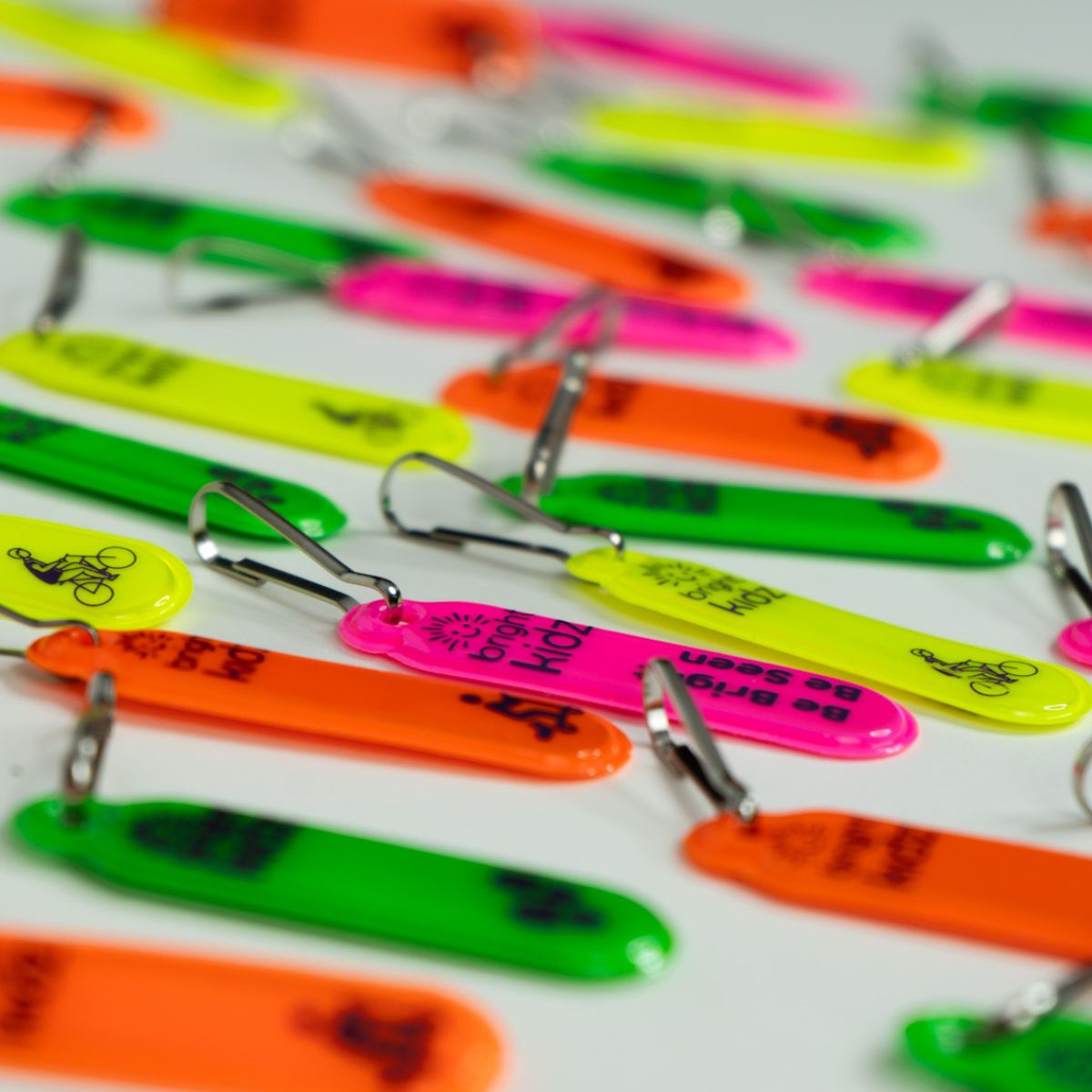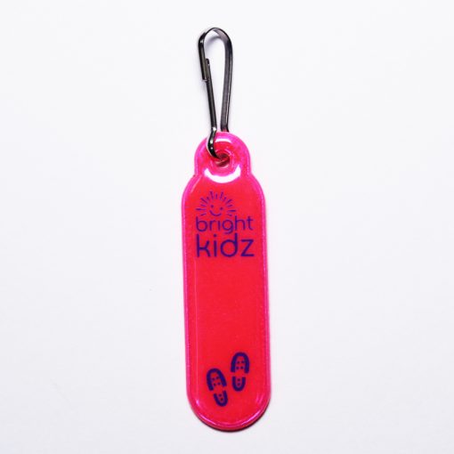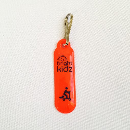 A reflective zip pull to attach to a zip, keyring or bag. Not just for zips – our fun reflective zip clips can be attached to bags too. They swing and reflect the light from cars at night. These fluorescent colours show up really well in daytime and near dusk too.