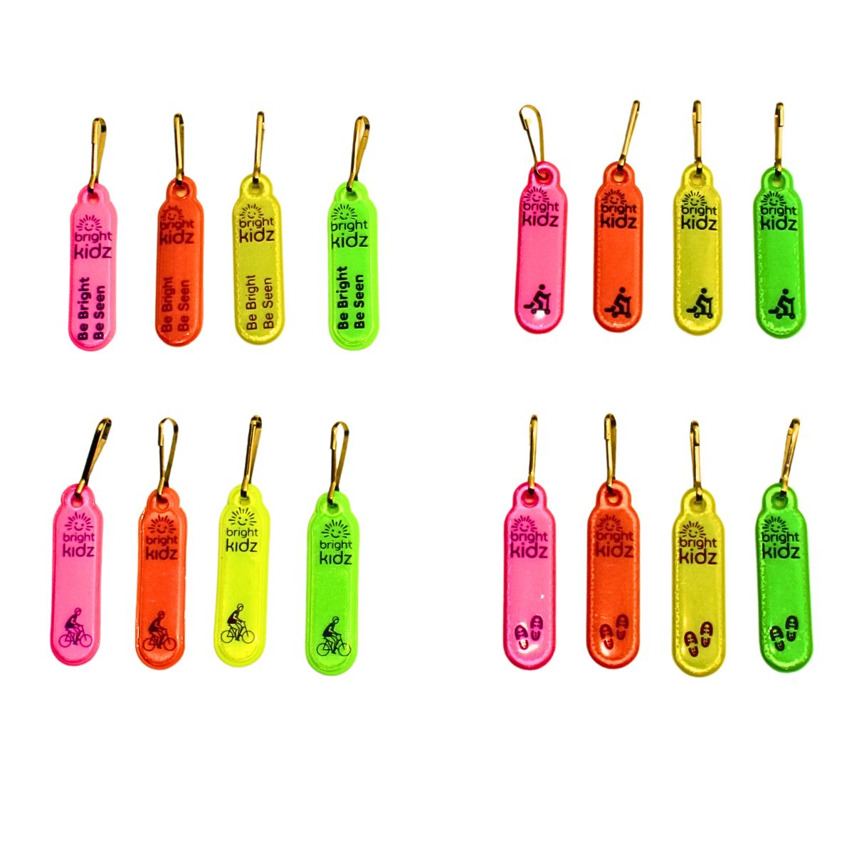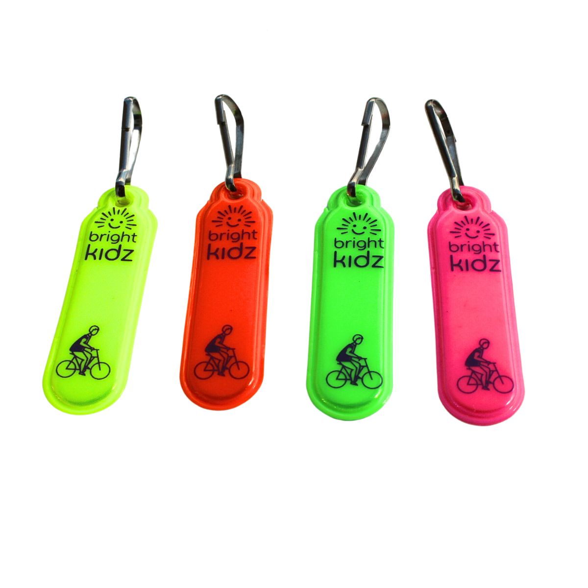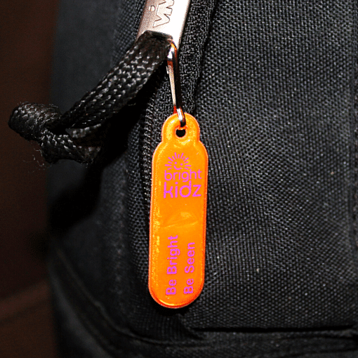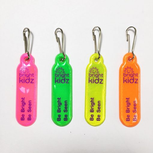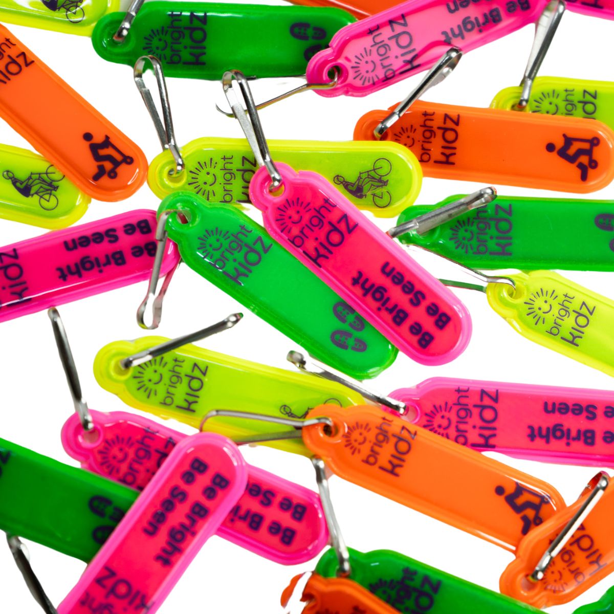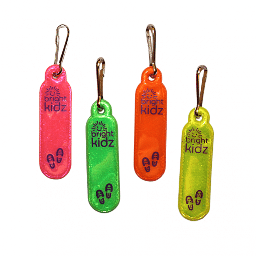Not just for zips – our fun reflective zip clips can be attached to bags too. They swing and reflect the light from cars at night. These fluorescent colours show up really well in daytime and near dusk too.