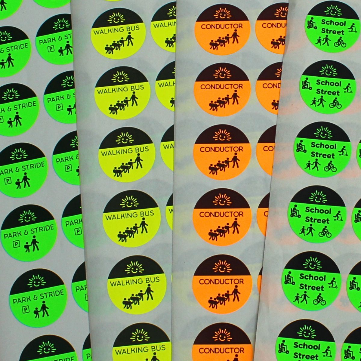 - Fun, colourful ‘Walking Bubble’ design with choice of two messages: ‘walk, cycle, scoot’ or ‘park and stride’.