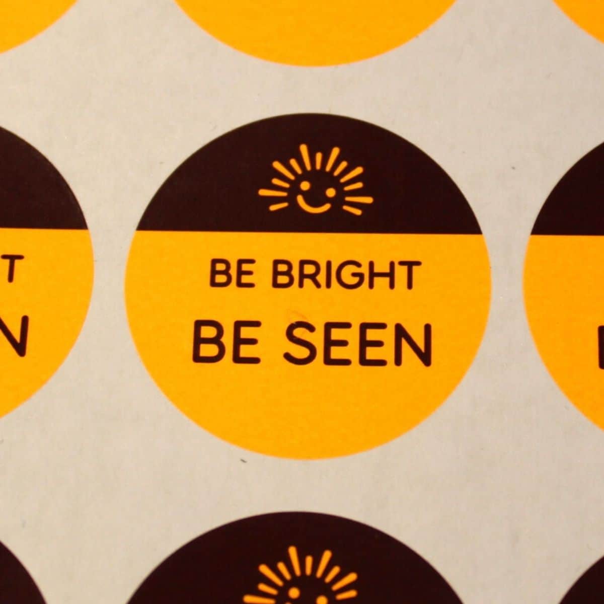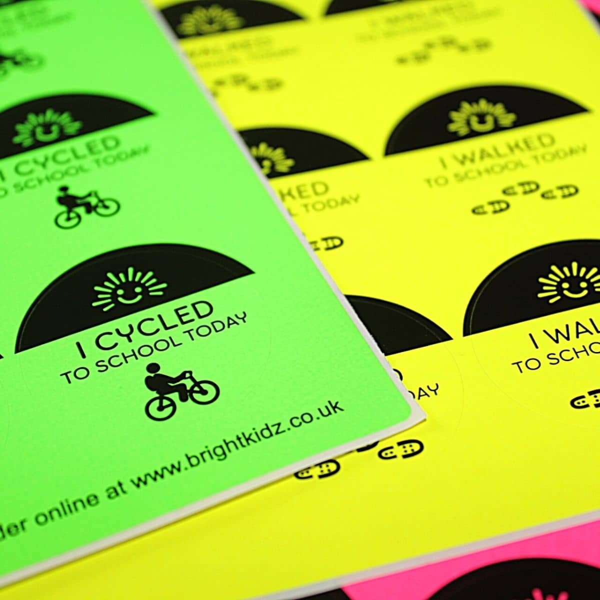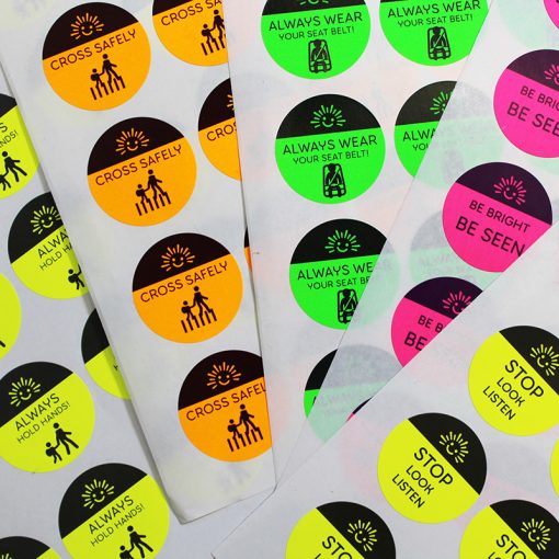 Kids love these! They’re fluorescent, fun and help to get across the message. If they are stuck on to school bags you will see them from afar (this helps children AND parents realise how fluorescent colours help you to be seen).