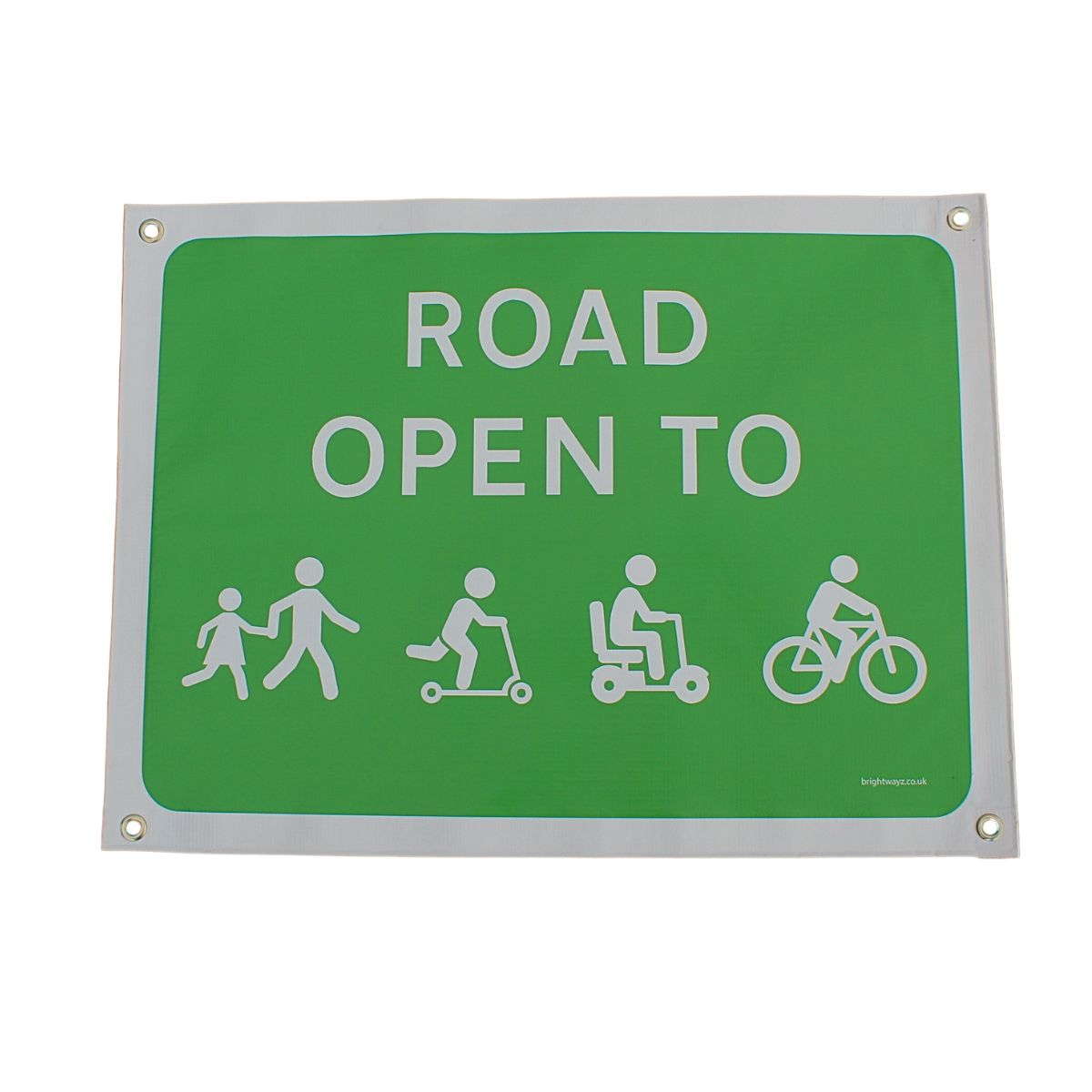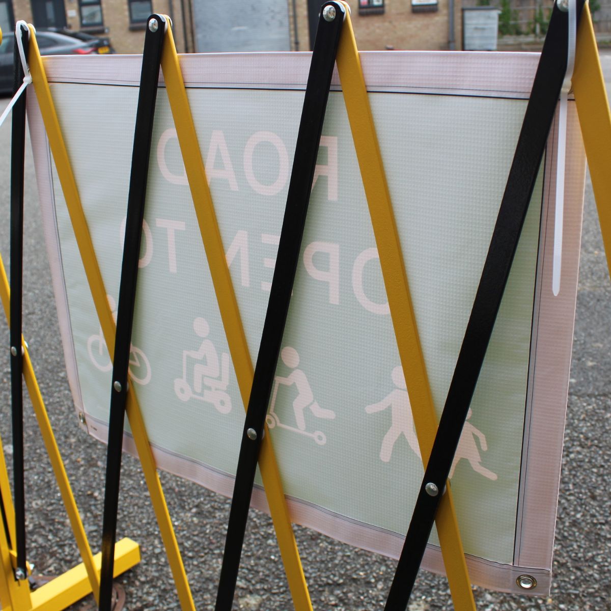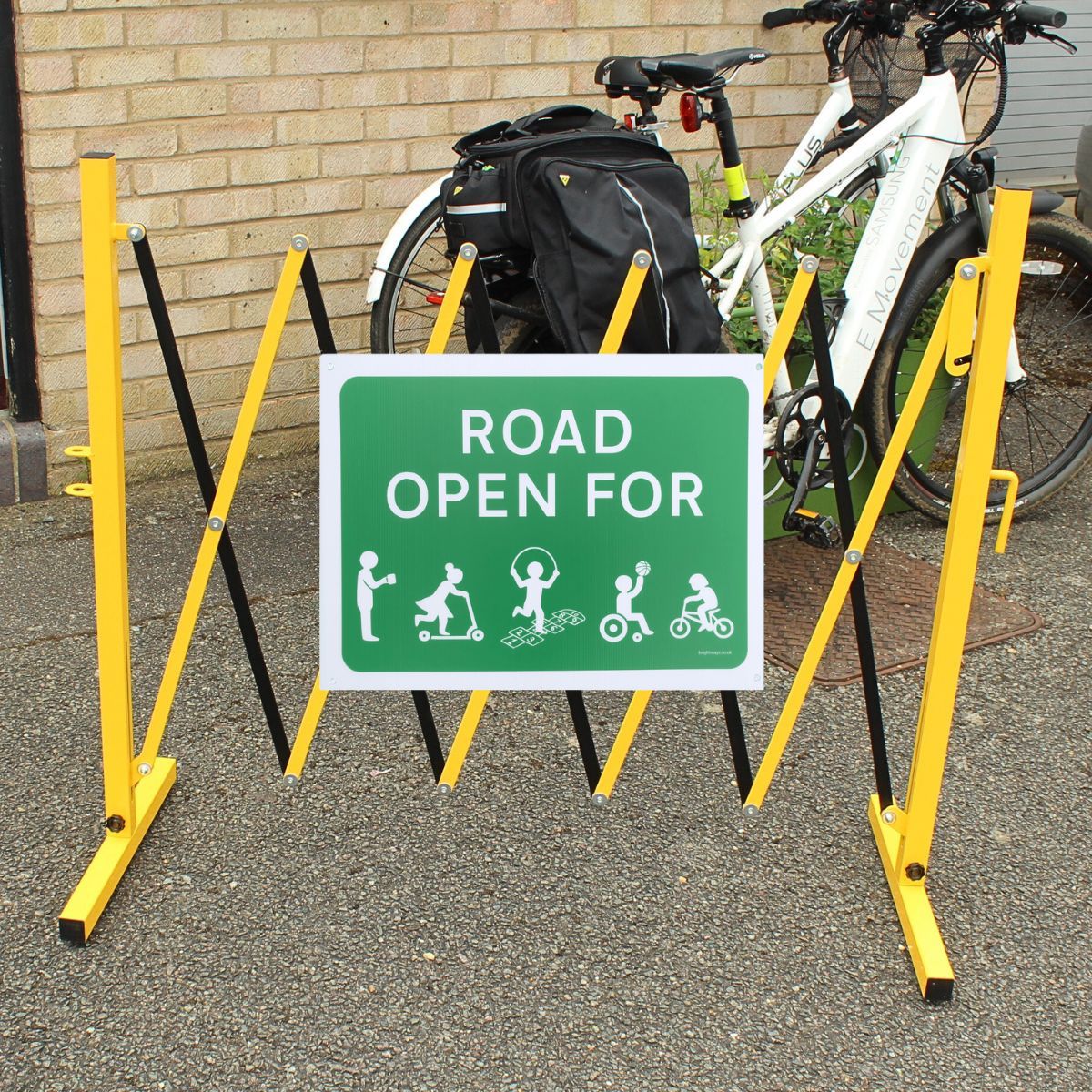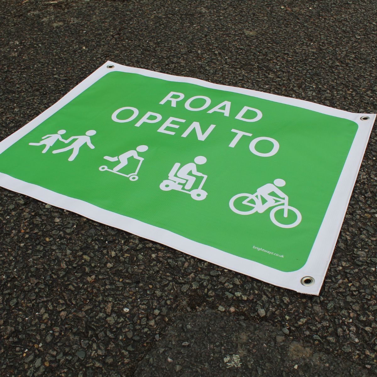 This Road Open to Active Travel sign is to help promote the positive aspect of a road being officially closed to motor vehicles - and open to everyone else... those walking, cycling, wheeling or scooting. This sign can be temporarily tied to a fence or railings.