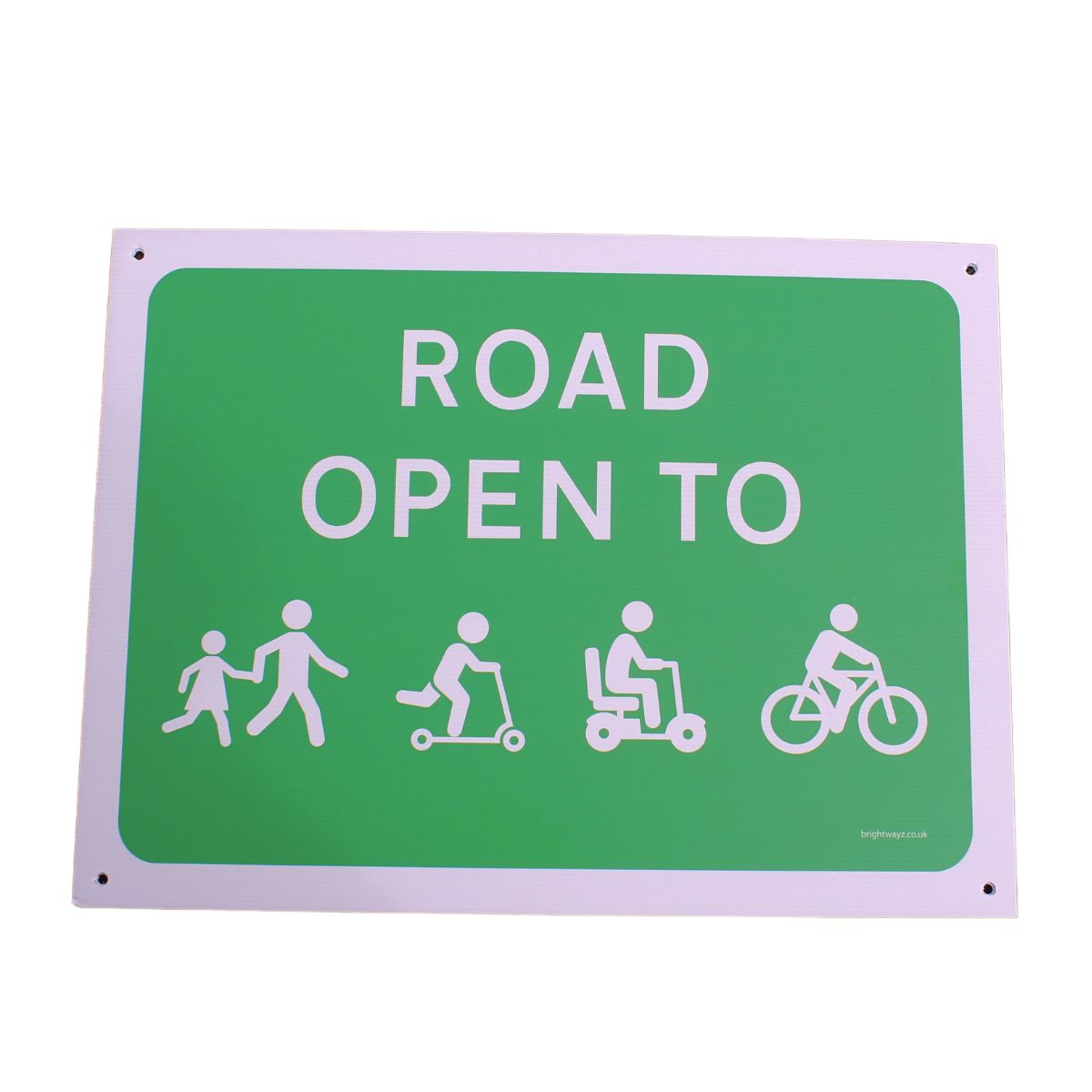 - Green ‘Road Open to’ correx board sign featuring active travel modes.