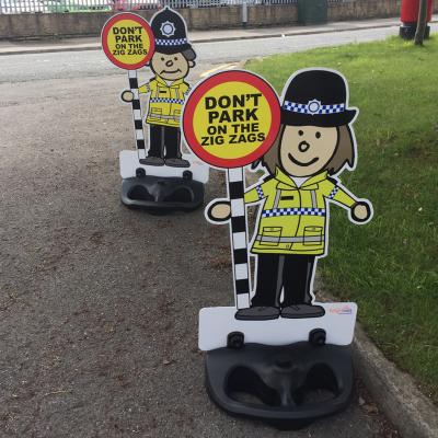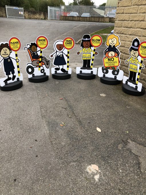 - All designs displayed are available on request. Options include: police officer (male), police officer (female), school boy, school girl, mum with pram, child in wheelchair. Choice of message on signs. Choice of skin tones (light, medium, dark).