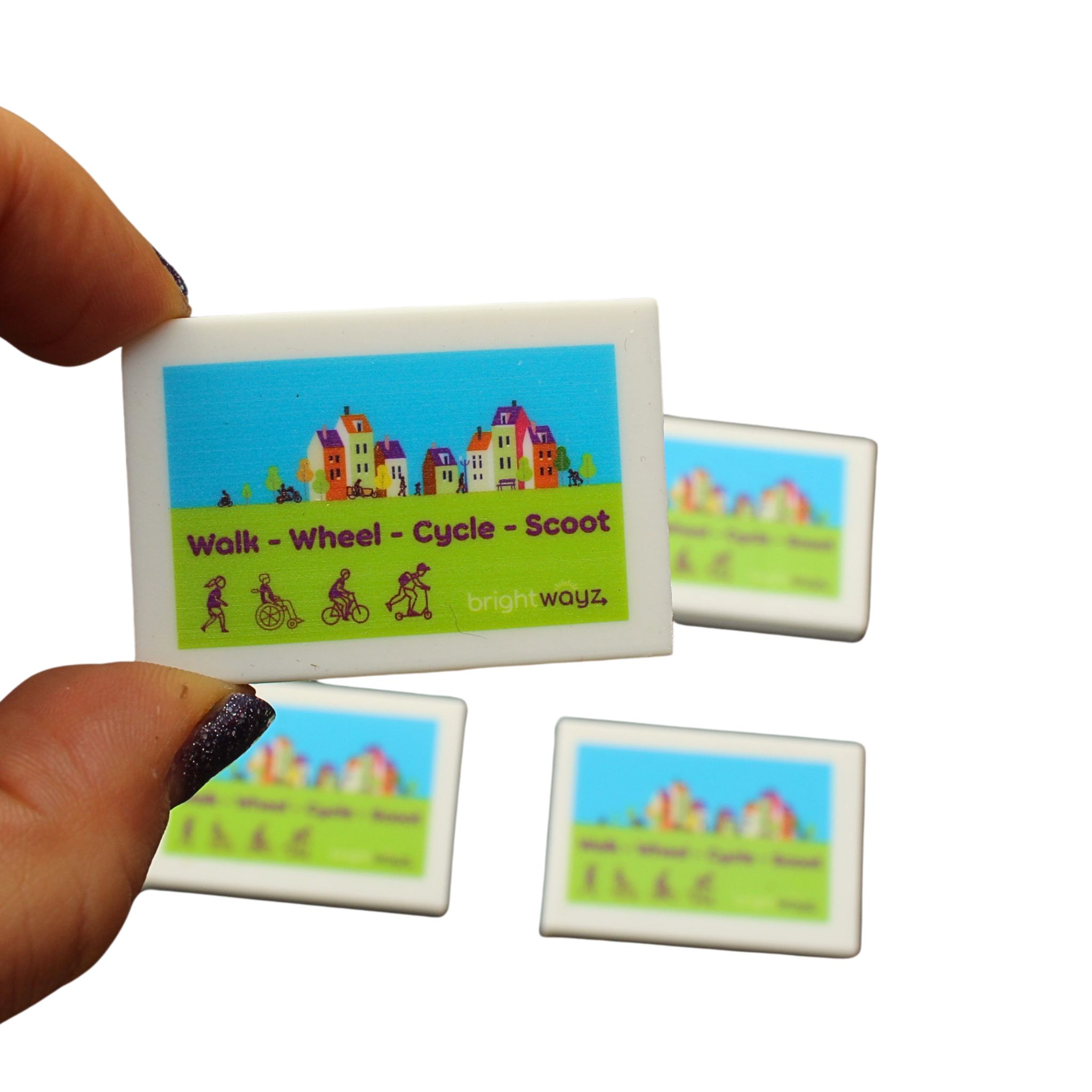 High quality rubber with engaging 'active travel' design featuring walk, wheel, cycle and scoot icons.
