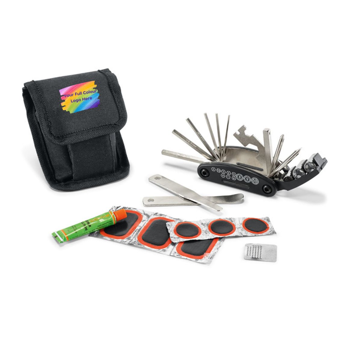 Ideal set to promote your compaign and keep your bike in tip top shape to mend any nasty punctures that come your way. All items are stored in a handy pouch with a rear belt loop. Great incentive or reward for anyone taking part in cycle training events.